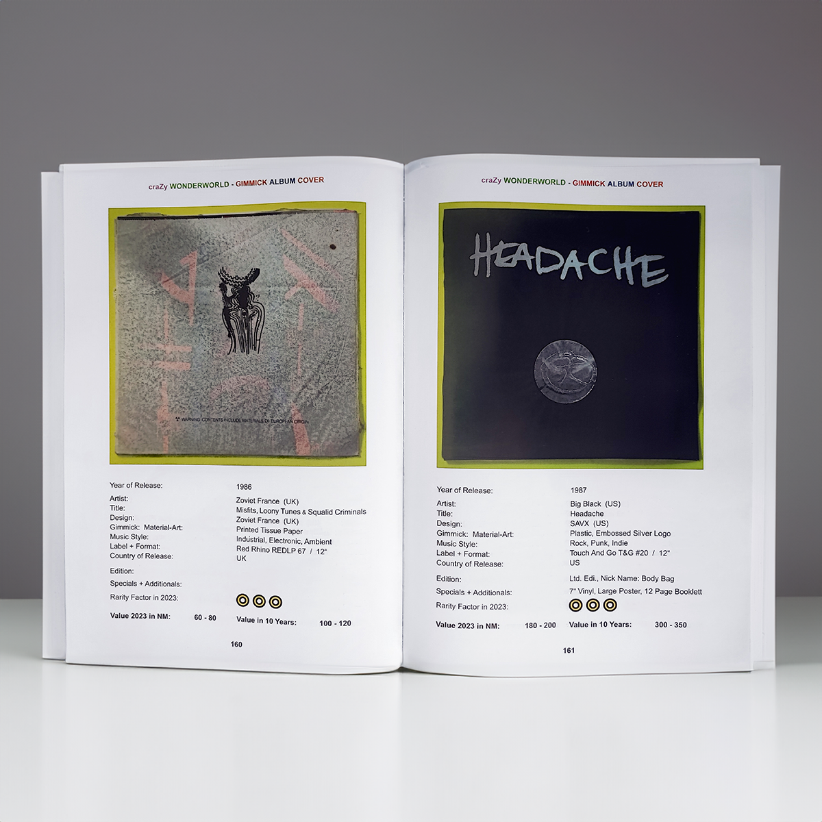 Discover the fascinating universe of gimmick album covers and packaging in the unique WORLD CHRONOLOGY! On 288 pages, the book presents over 250 materialistic covers from nine decades (approx. 1930-2023) and made from more than 30 different materials, from edible paper to sheet steel covers. With images of rare exhibits, including one of the world's first record sleeves from 1904, the world's first official 12" vinyl sleeve from 1946 and the first misprint of a 12" vinyl sleeve, also from 1946 - all exclusive, not found on the Internet or listed in other print works. Find out the current value of these exhibits and their future value forecasts. Limited, numbered and bilingual in English and German.